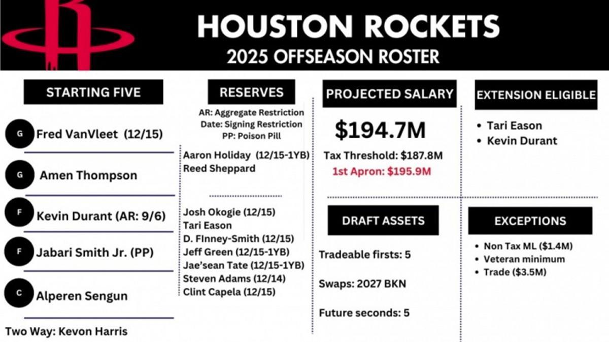 这意味着,火箭队如果后续没有交易与裁员调整,大概率将以现有的14人大名单进入新赛季,具体人员如下: