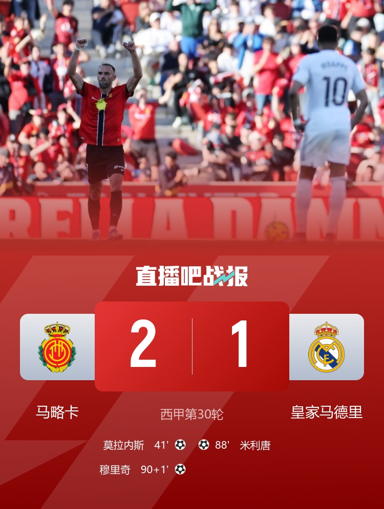 爆冷!皇马1-2遭马略卡绝杀 皇马各赛事5连胜终结、落后榜首7分