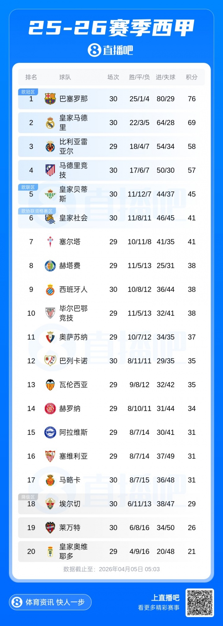 西甲积分榜:巴萨绝杀马竞7分优势领跑 皇马本轮先赛被马略卡绝杀